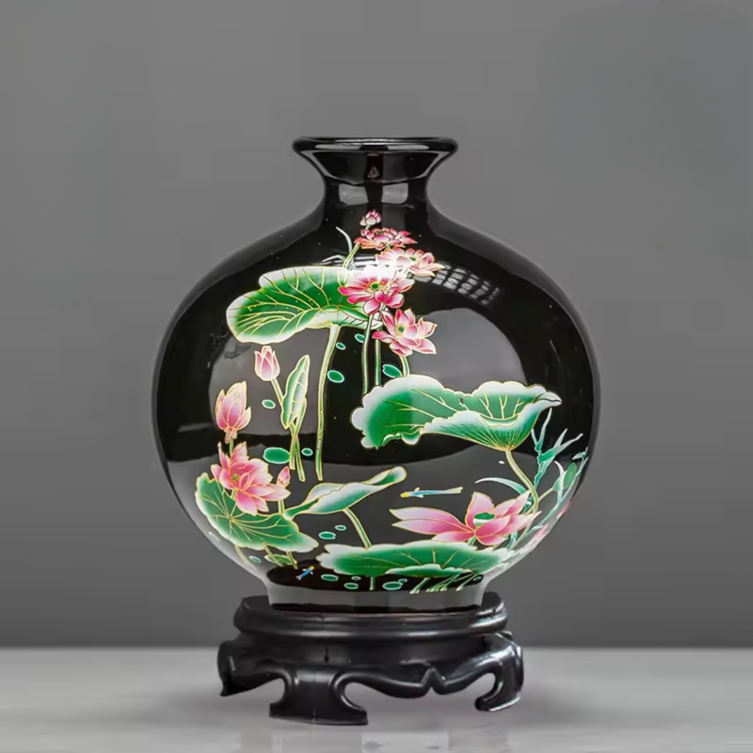 Förhöj din inredning med BloomCraft™, där tidlös konstnärlighet möter lyxig design. Dessa vackra vaser har intrikata handmålade lotusblommor på en rik svart porslinsbas, vilket skapar en fängslande visuell kontrast. Perfekt för dig som uppskattar fina detaljer. Varje vas ger en touch av elegans och lugn till ditt hem eller kontor.